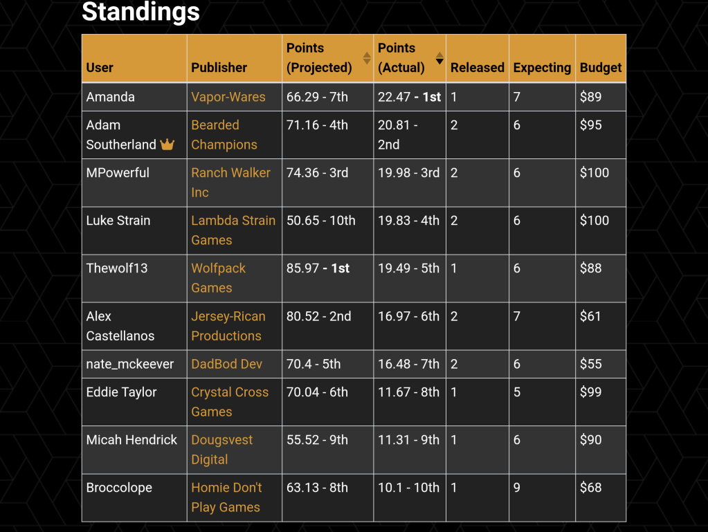The last note that I’ll make for this month is that Helldivers II was released this past month to positive reviews and way more players than Arrowhead were ever expecting! This gave Adam’s Bearded Brethren some good points in the standings, but more than that, it took 12.3 points away from Marshall’s Ranch Walker Games! There always seems to be a costly counter-pick on the season and I wonder if this will be it or is it the first of many.