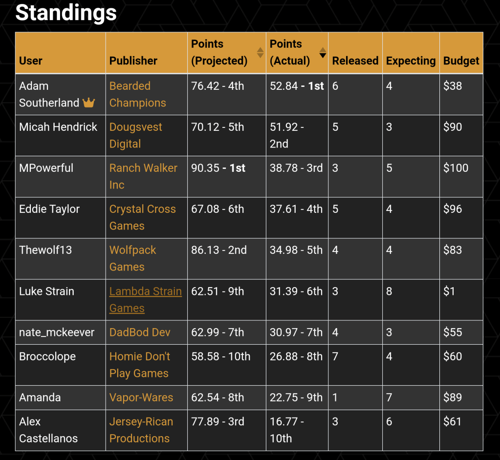 Ranch Walker Inc.’s Animal Well (19.1pts) and Homie Don’t Play Games’ Lorelei & the Laser Eyes (17.6pts.) were the big winners this month giving their publishers a nice boost to their overall scores. Lamba Strain Games also did quite well with his decision to publish Paper Trail (12.1pts).
