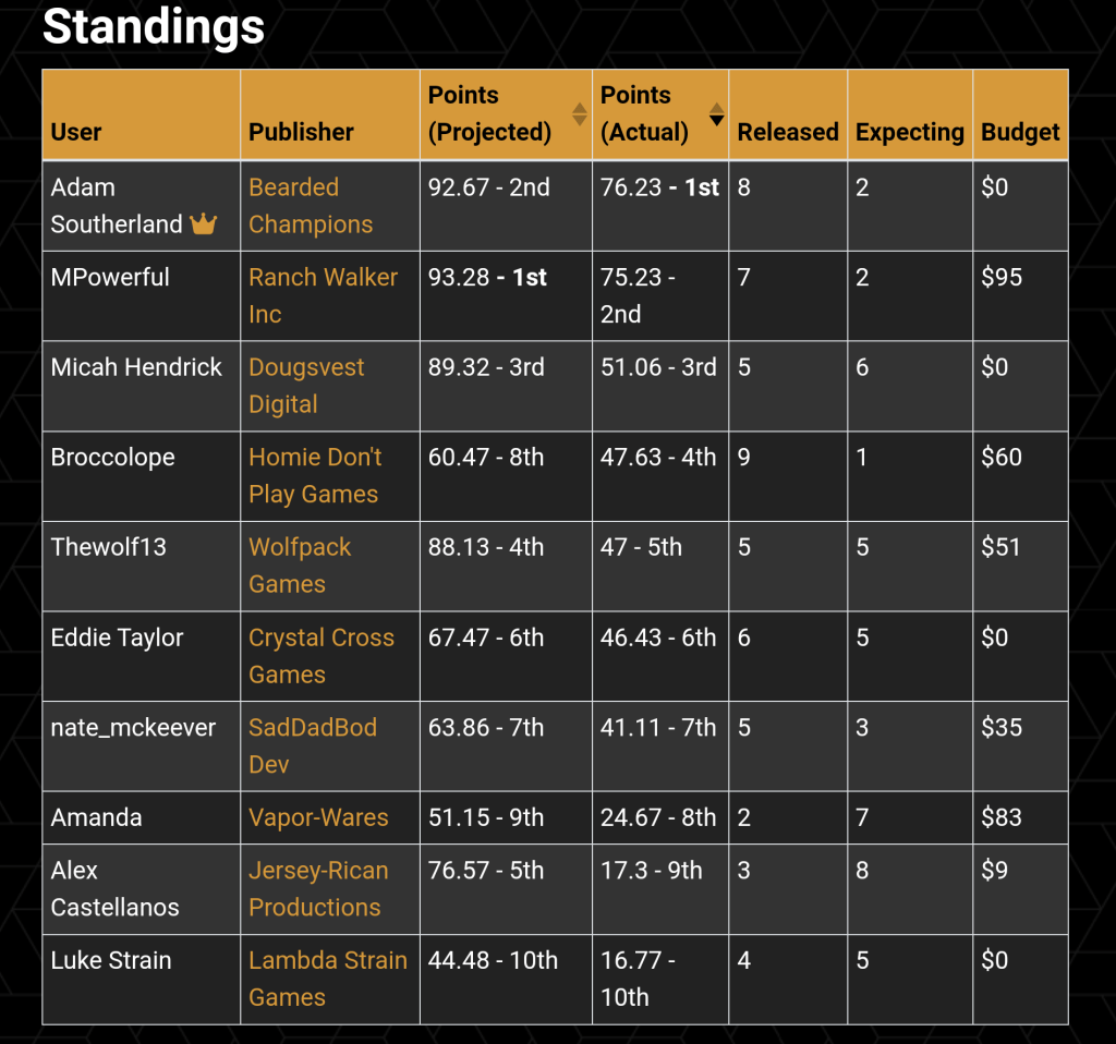 Meanwhile, Eddie [Crystal Cross Games] received the best reviewed game of the month in Tactical Breach Wizards (17pts). A true surprise to say the least, the indie Tactical RPG was able to lift Eddie from 7th place to 6th place by the end of August, and with three more games releasing in September, I’m sure Eddie is looking to really make his move up the standings this month! *{Eddie’s games of September: Star Trucker (Sep. 3rd), Warhammer 40,000: Space Marine 2 (Sep. 9th), Test Drive Unlimited: Solar Crown (Sep. 10th)}