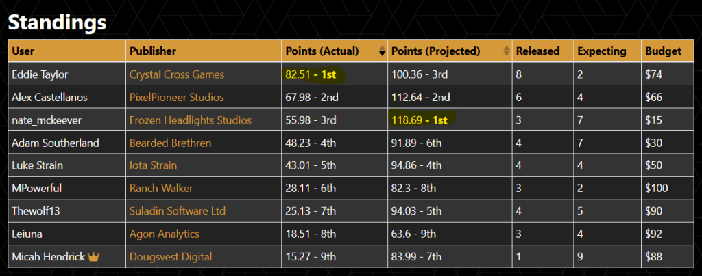 The highest reviewed game this month belongs to Crystal Cross Games (Eddie) and the release of “Monster Train 2” (18.6 pts). Eddie has been doing a good job of having at least 1 game released each month to stay on top of the Standings thus far. Of course, that means that Eddie only has 4 spots left for the entire second half of the season. Just how long can he expect to hang on before someone overtakes him!