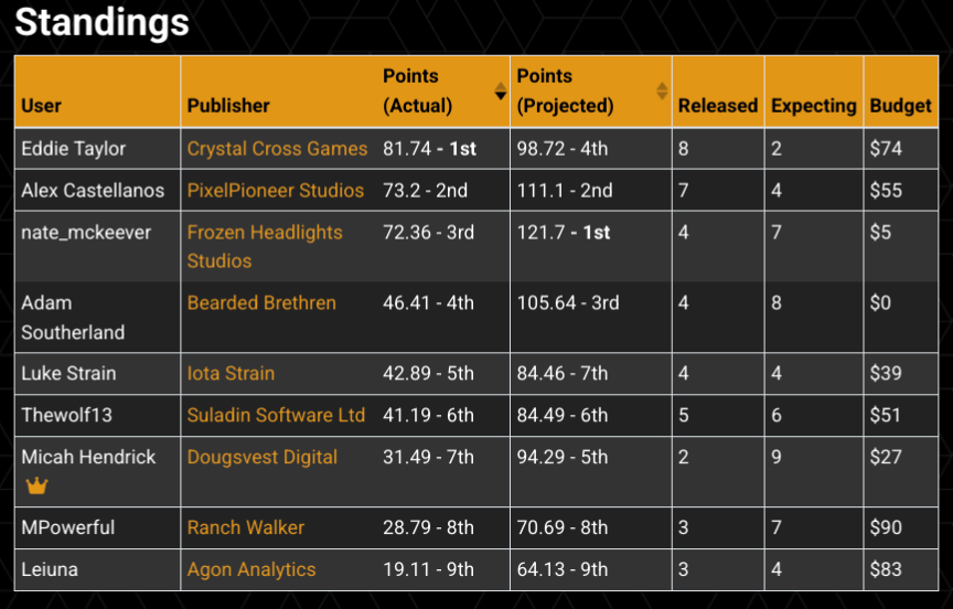 I think the most surprising game of this month belongs to Dougsvest Digital’s pick of “The Alters” (16 pts).The combination of survival & foraging mechanics, base-building, & major narrative choices makes for an interesting gameplay loop. The story that is being told is also intriguing with a space-miner and his many ‘alters’ or clones, and their journey to escape a planet that can kill them. It seems that reviewers really took a liking to all of it, so good job, Micah, on a great addition to your roster.