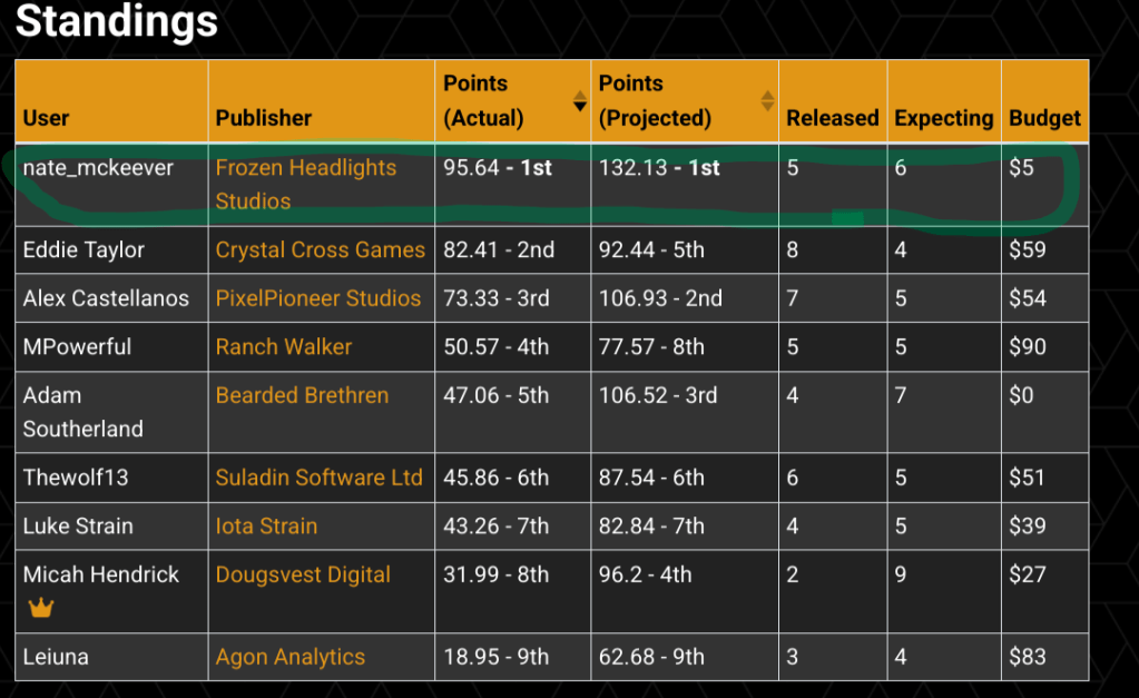 The other games released in July were “Wheel World” (5.5 pts) & “Wuchang: Fallen Feathers” (5.7 pts). These games have received plenty of praise in addition to a few critiques and have scored respectfully this month – falling just short of that coveted 80+ standard the DCL loves to see. While I’m sure that Suladin Software Ltd. and Ranch Walker were hoping for more from these titles, getting some meaningful points on the board will definitely improve their chances of finishing well in the standings.